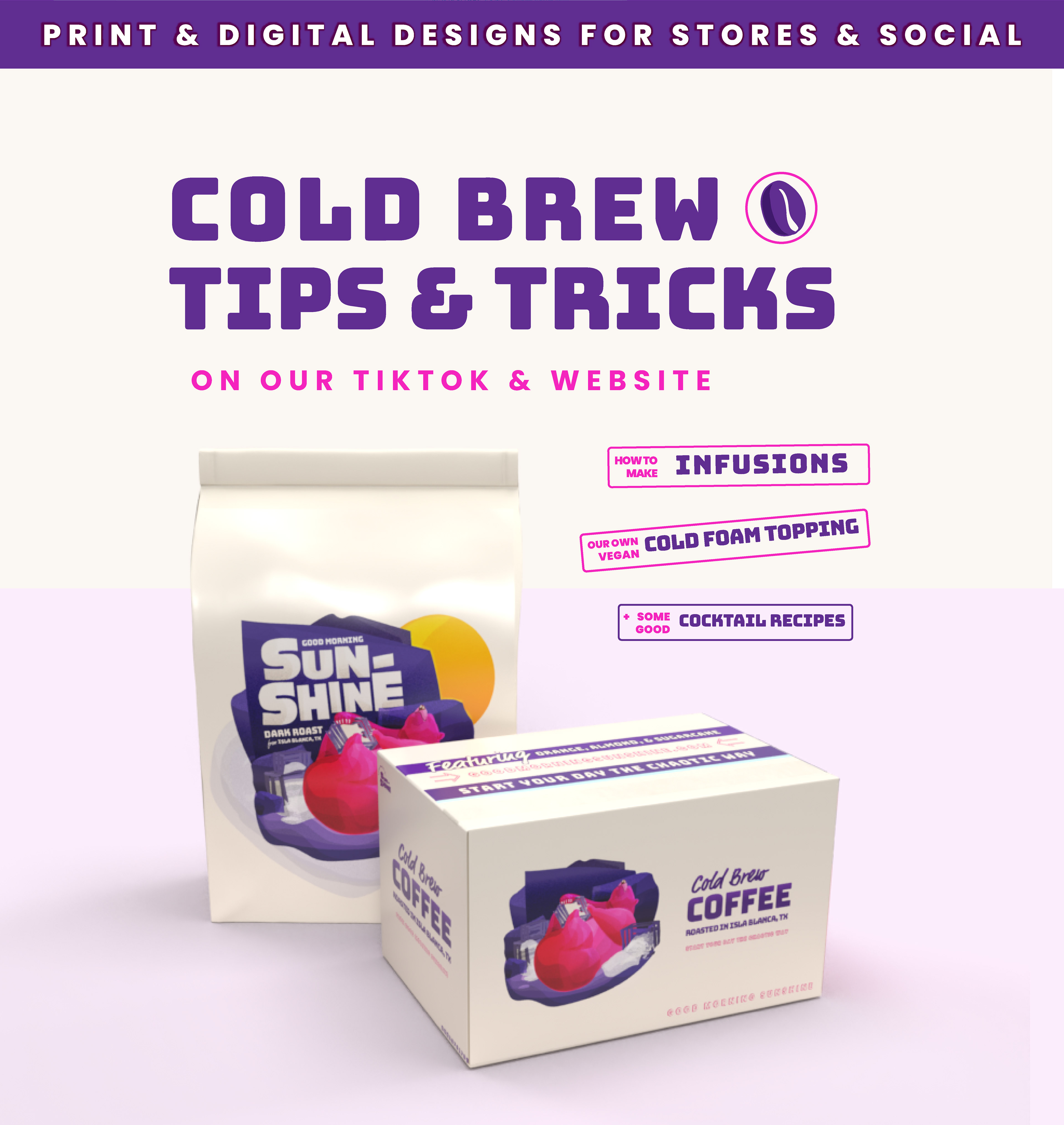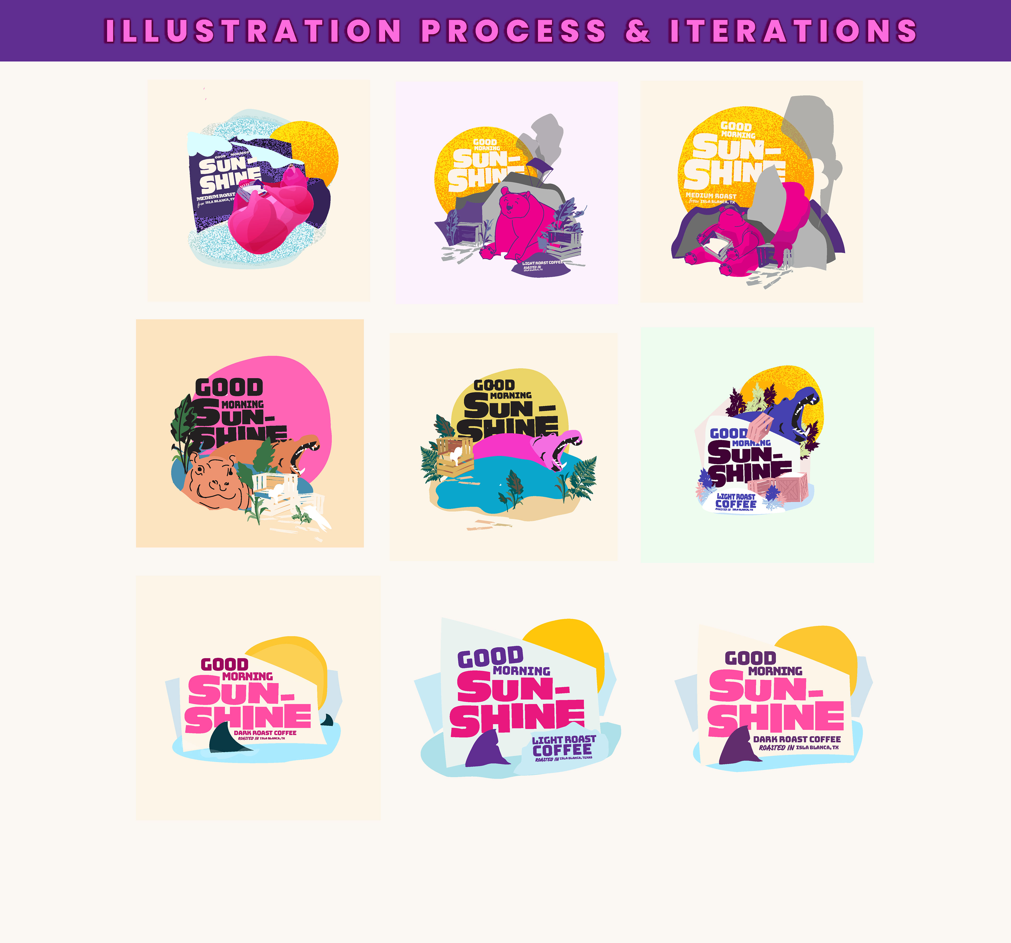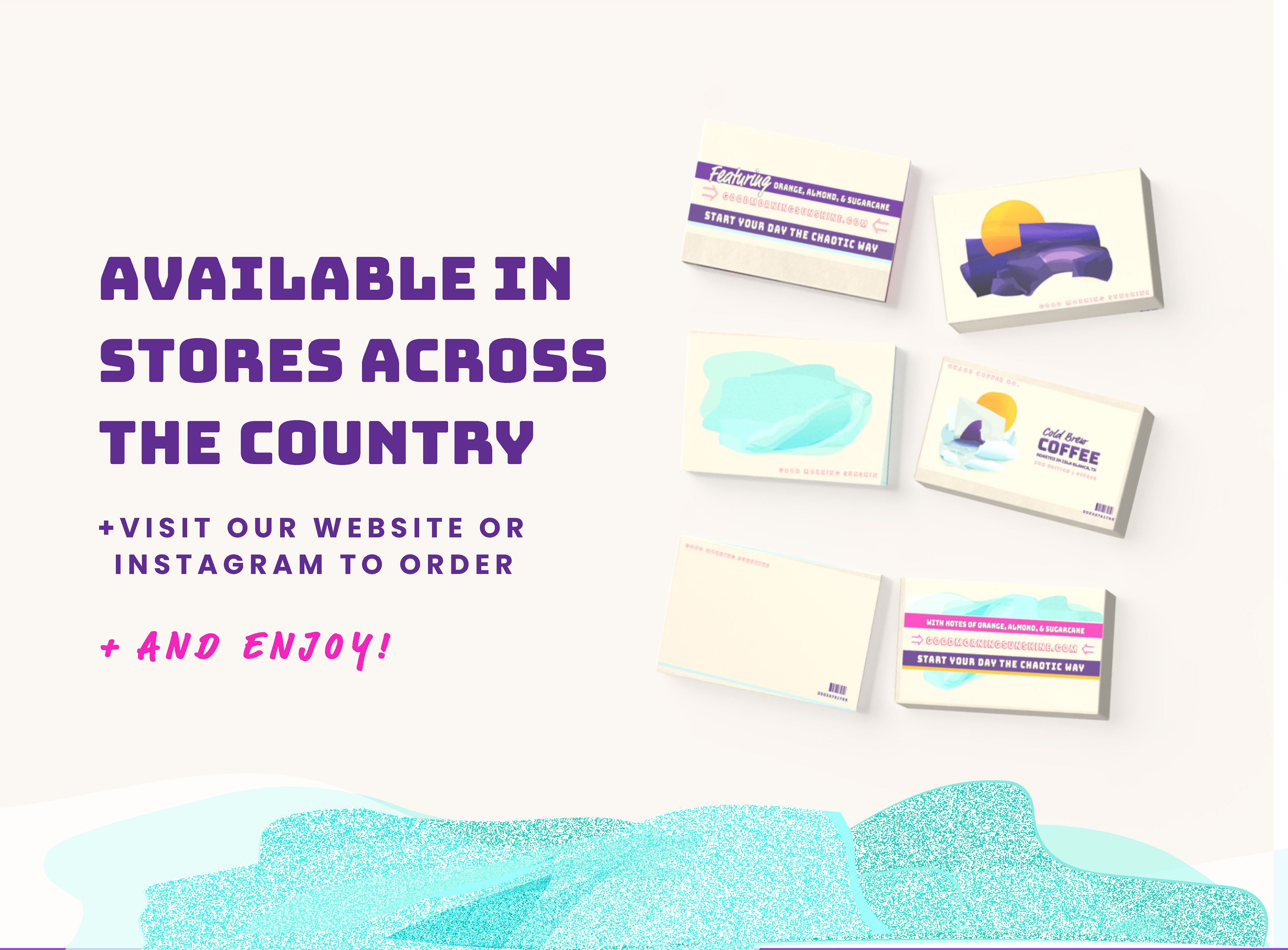 Goooood Morning, let's get this day started! Good Morning Sunshine is a fun coffee brand from South Texas, bringing a little extra fun chaos to the start of your day. Their almost too-colorful packaging is inspired by true stories of humans messing up the general vibe--you know, the classic. Creating the illustrations and layouts for this brand was tons of fun -- can't wait to see it on shelves!